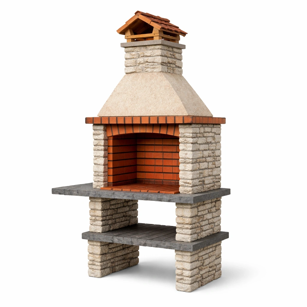 Barbacoa de ladrillo refractario y cantera con chimenea