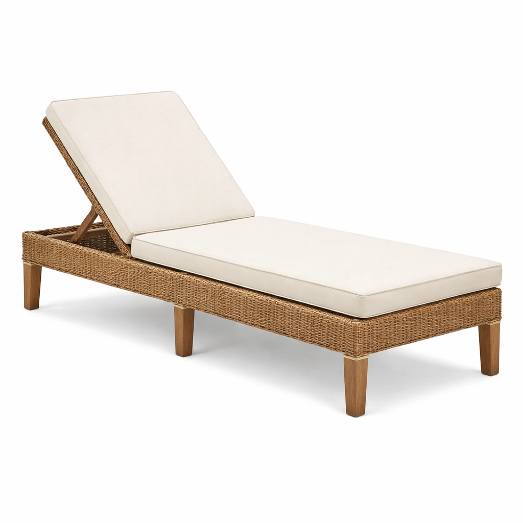 Tumbona fabricada en ratán sintético resistente a la intemperie con estructura de madera. Los cojines están hechos de espuma de poliuretano con una funda de poliéster, proporcionando comodidad y durabilidad.